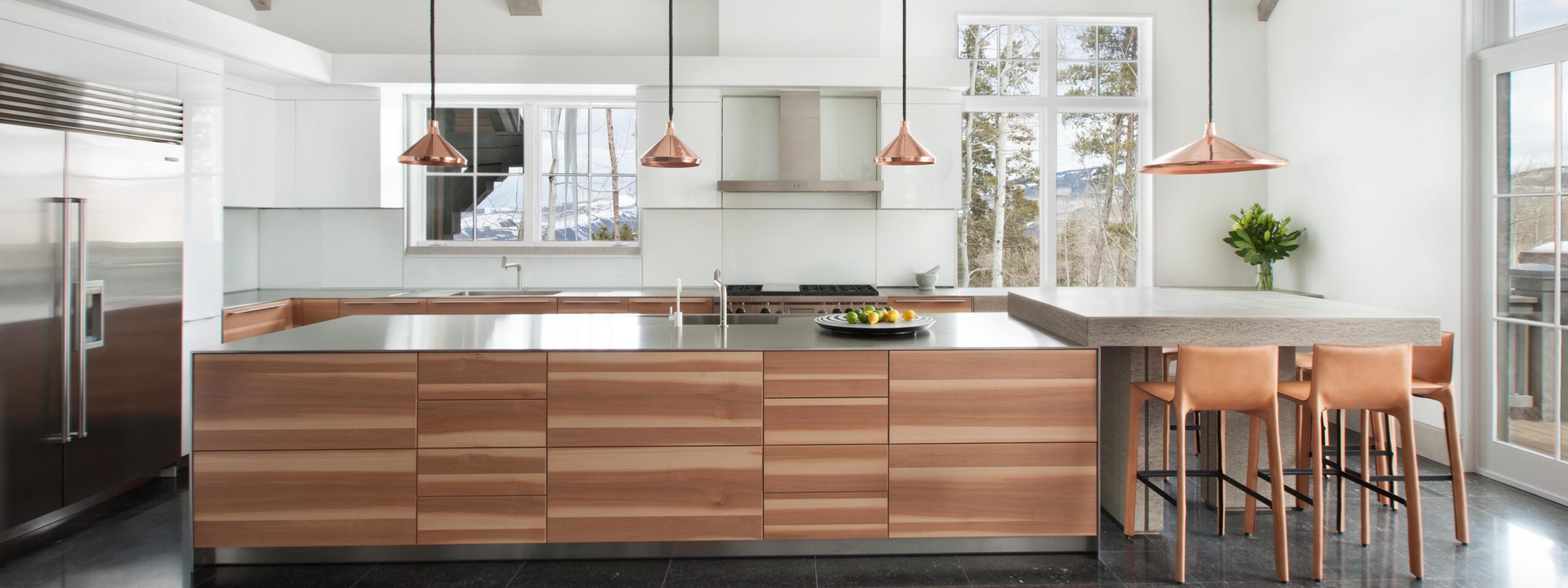 The Modern Mountain Renovation took a rustic log home and elevated it into a contemporary mountain masterpiece in Bachelor Gulch. A ski-in, ski-out dream home, this transformative renovation stars a sleek German Bulthaup kitchen with stainless-steel and concrete countertops, applewood doors, and contemporary cabinets. This six bed, eight bath home comes with a three-car garage, an exercise room, a sauna, a custom gunite spa, a wine room, and a game room. The main living spaces feature gorgeous soaring ceilings with exposed beams and elegant lighting elements. Two custom staircases lend extra character to the home. One, adjacent to a wall of built-in bookshelves, is an open stair with engineered wood box tread and features a steel and glass railing. The main stair is a sweeping double compound radius glass stair, with gentle curves that are stunning in their visual simplicity and contrast to the wood beam pillars beside it. At every turn, the Modern Moutain Renovation blends comfort and gentle opulence into a truly magnificent home.