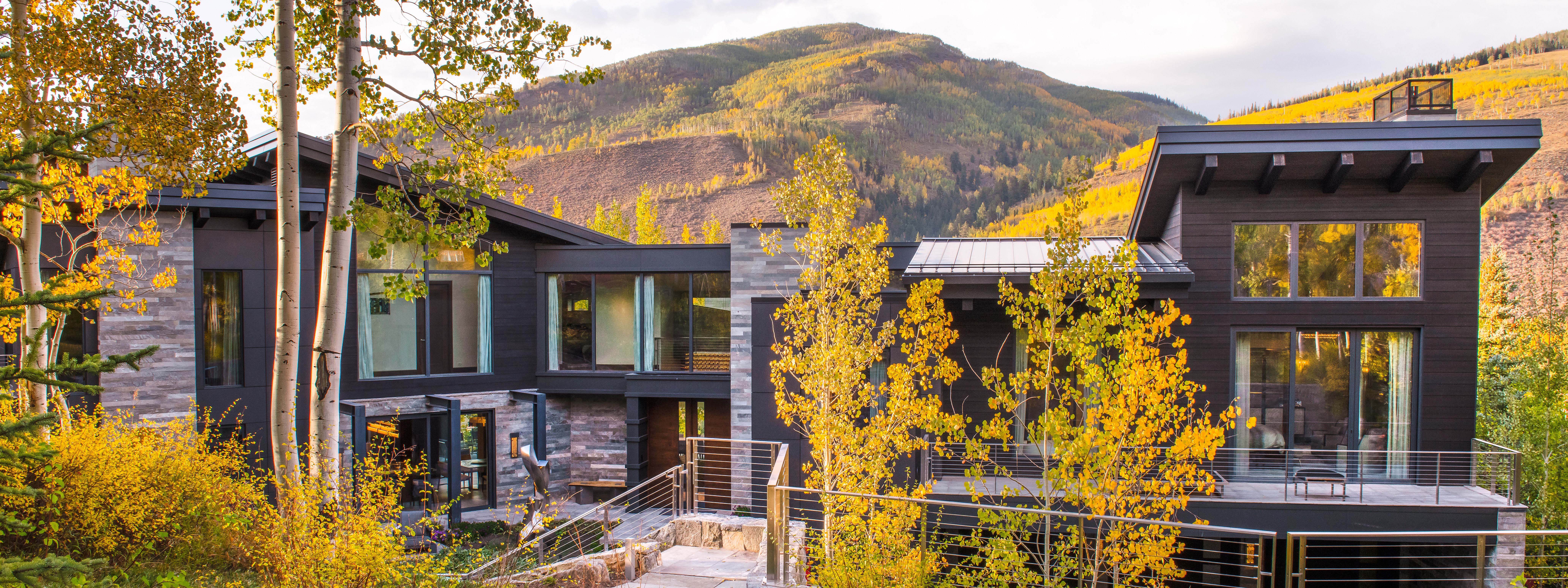 Nestled amongst the aspens on a ski-in, ski-out property in Vail, the Rockledge Residence is a gem of contemporary architecture. This five bed, seven bath home strikes the right balance between a stately presence and being perfectly in tune with the mountains. A butterfly roof, European windows with expansive glass, a cantilevered dining room, and multiple fantastic exterior decks all capture different angles on the best views of Vail. Inside, unwind with a spa and massage room, a hot tub, a wine room, an in-home gym, a game room, and a custom two-sided fireplace with blackened steel, bluestone, and a custom contemporary metal log set. In the master suite, a stainless-steel television wall makes the inclusion of technology a work of art. An elegant custom staircase, with six-inch thick glass treads, steel stringers, stainless-steel handrails, and wire cable details connects the levels, with an elevator also available. Outside, a beautiful contemporary art sculpture complements the exterior cement panels with quarter-inch reveal. This tight site had no drain easements for construction, but the project was completed successful by maintaining access to the site through the eastern neighboring property. The client’s good relationship with their neighbors was maintained through communication, communication, communication at every turn, and now the Rockledge Residence is an elegant, semi-secluded retreat.